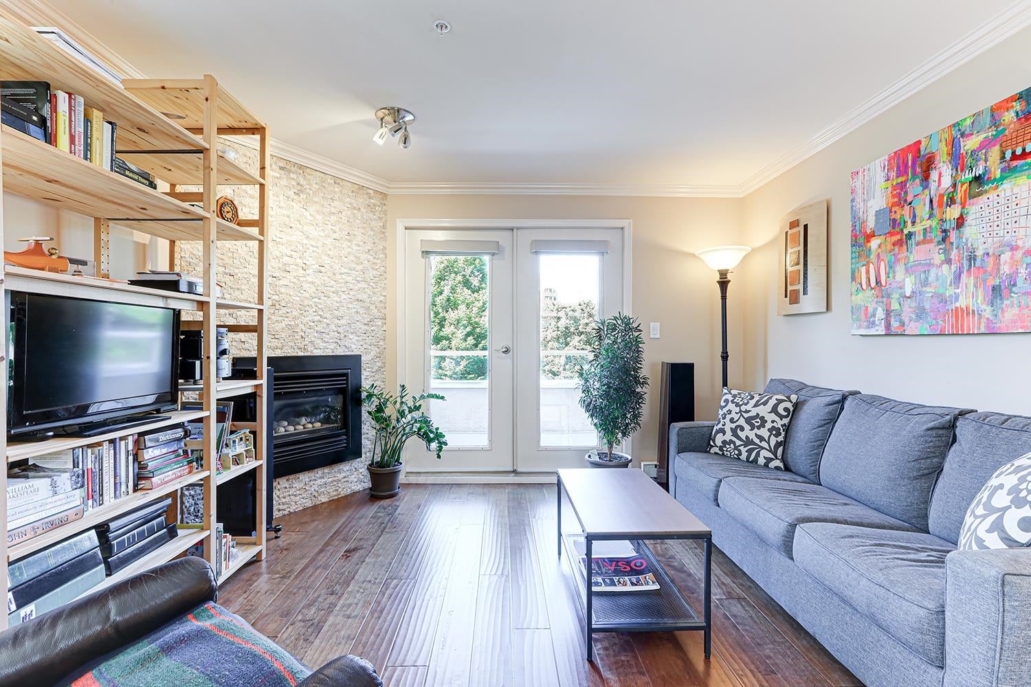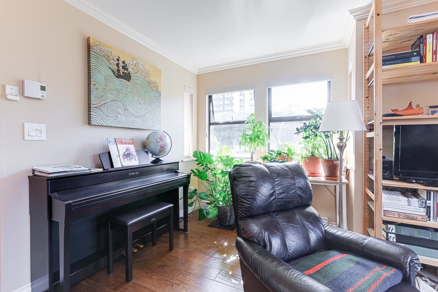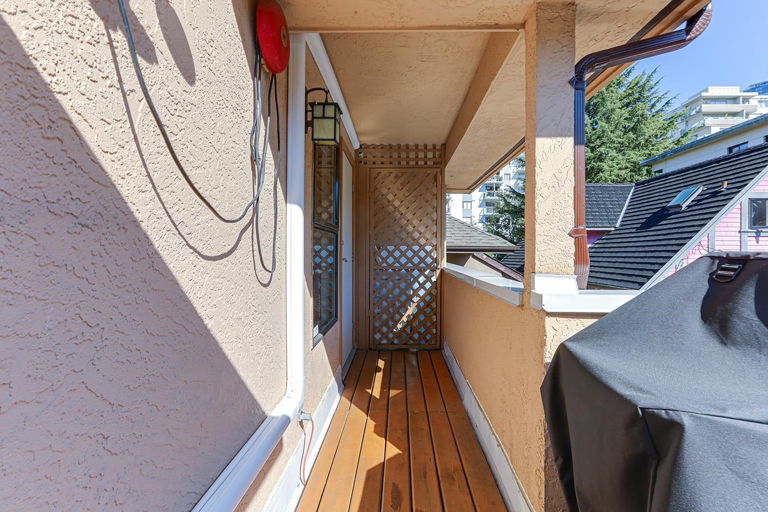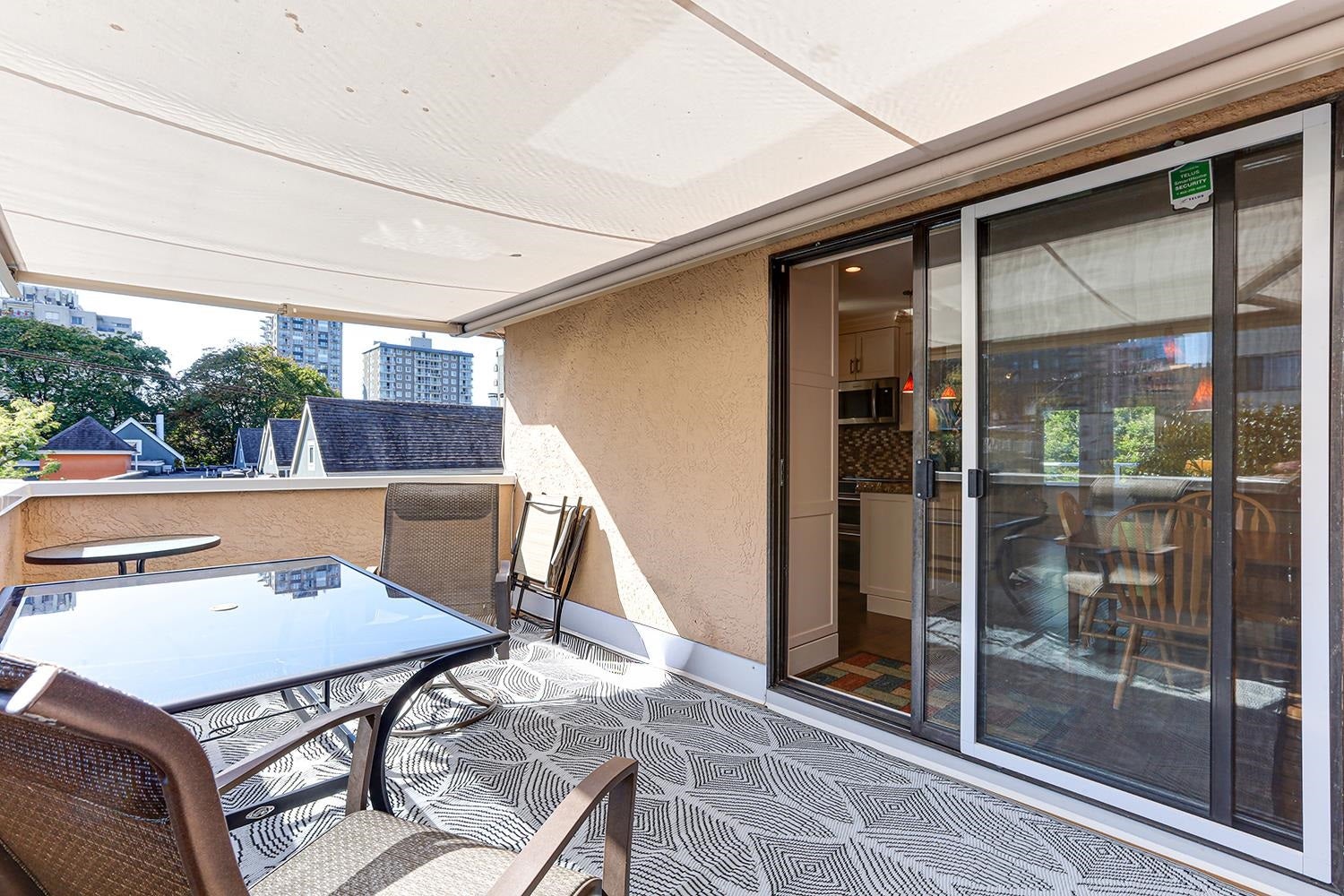Penthouse that feels like a house! Bright & spacious 2 bed, 2 bath with windows on all sides and no shared walls—breezes & treed views in every room. Living room features hardwood floors, gas fireplace and French doors to a NW balcony. Large kitchen with white shaker cabinets, granite counters and new induction stove w/ double oven opens to a SE deck (15'3" x 8'8") w/ BBQ space, patio set and powered awning. Stairs to garden & planters. New carpet in bedrooms, heat pump, (Heat & AIR Conditioning 2021), roof (2017), in-floor radiant heat in both baths & entry. In-suite laundry, 1 parking, locker, 1 cat & 1 dog allowed. Prime West End—steps to Robson Street, schools, Nelson Dog Park, minutes to Stanley Park & English Bay, across from Barclay Heritage Square. Call your REALTOR. to view.